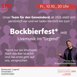 Am 10. Oktober stellen wir unser Team für den Gemeinderat vor – und das auf echte Burgthanner Art: Bei einem Bockbierfest mit Livemusik im “Legend”.