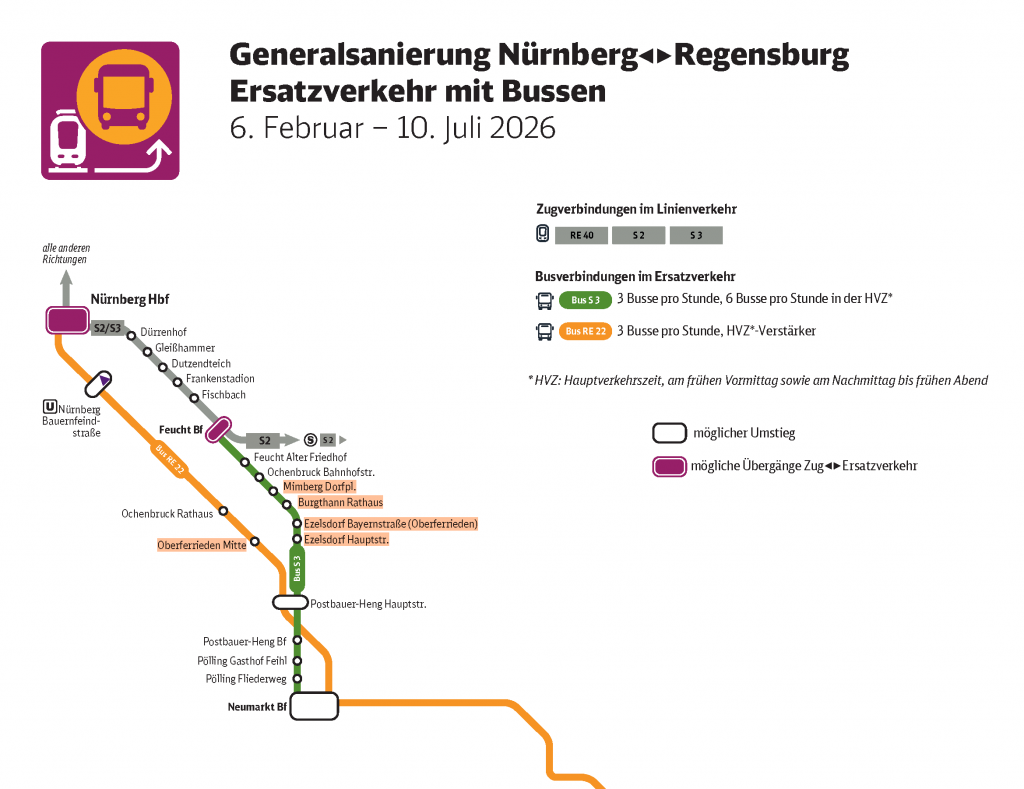 Die Bahn-Strecke zwischen Nürnberg und Regensburg wird in einer sogenannten Korridorsanierung generalüberholt. Dafür sperrt die Deutsche Bahn unsere S-Bahn-Strecke komplett. Zwischen dem 6. Februar und dem 10. Juli sind wir deshalb auf Schienenersatzverkehr angewiesen. Wir haben hier für euch Informationen gesammelt.
